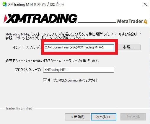 「-1」でなくても何でもいいのですが、このように少し付け足すだけで上書きされずに新たなMT4がインストールされます。
